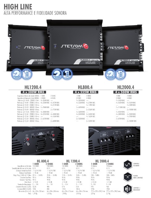 Potência @ 12.6V - STEREO 2 Ohms: 4 x 231W RMS 4 x 300W RMS 4 x 204W RMS 4 x 260W RMS 4 x 280W RMS 4 x 500W RMS