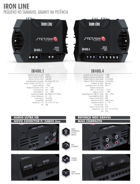 Potência 13,8V @ 2 Ohms: 400W RMS Impedância mínima de saída (Bridge): 4 OHMS