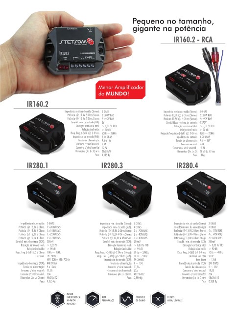 Potência @ 13,8V 2 Ohms: 1 x 280W RMS Impedância mín. de saída (Sub): 4 OHMS Impedância mín. de saída (Bridge): 4 OHMS