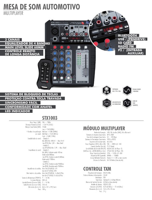 4 Bandas de equalização Mid Low ±15dB (500Hz) Modos de Operação: USB, SD, Auxiliar (LINE), FM e Bluetooth