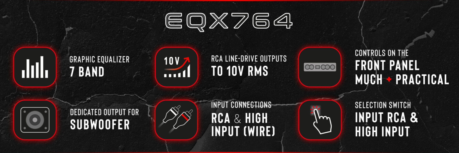 The EQX764 has dedicated outputs for the SUBWOOFER, in addition to the FRONT and REAR outputs, with various controls for adjusting and equalizing the audio, including: