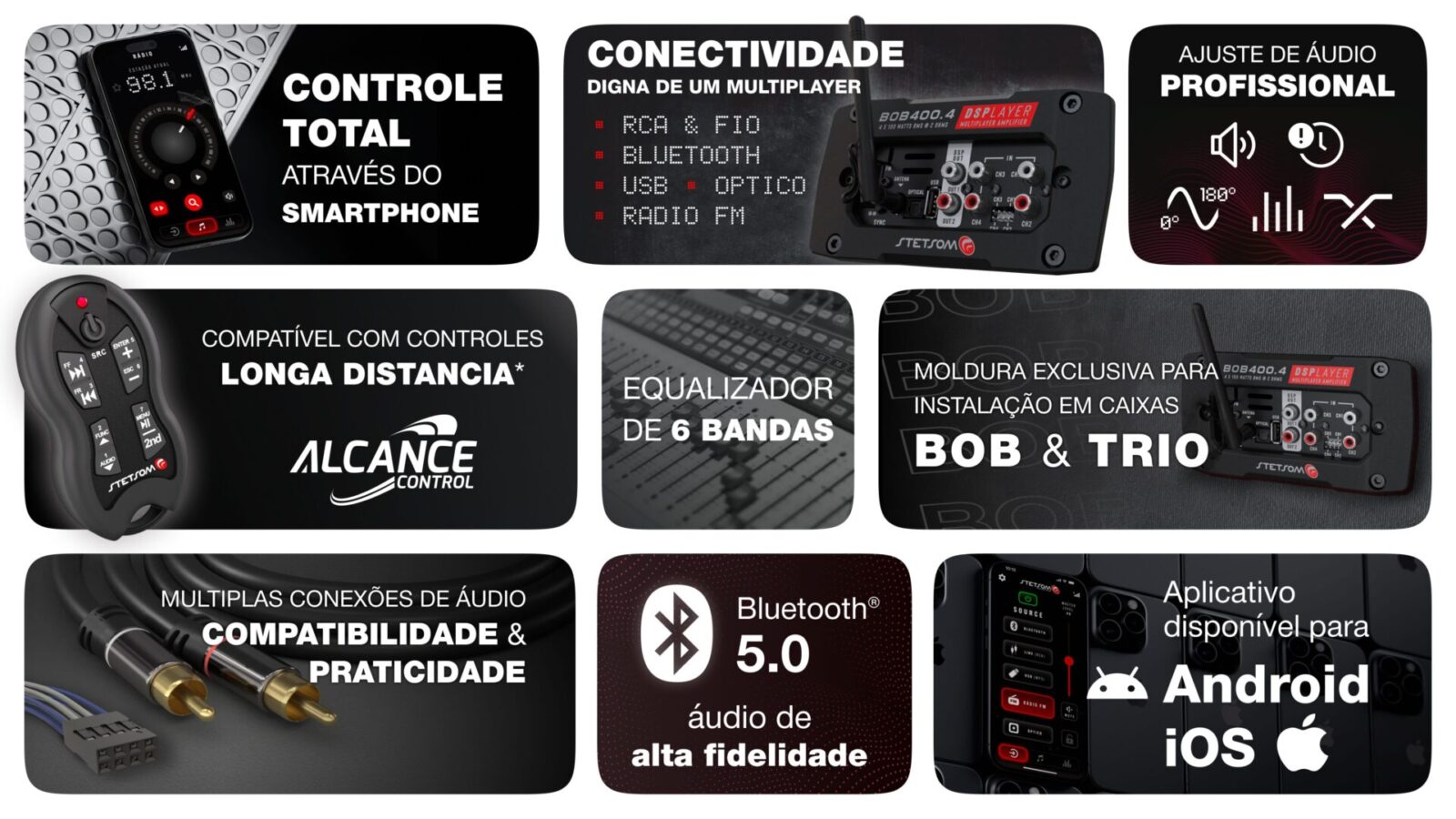 O BOBSPLAYER foi projetado para elevar sua experiência de áudio, oferecendo fácil instalação em caixas BOB, TRIO e personalizadas através da moldura de fixação. Sua amplificação possui mesma qualidade sonora da linha DSPLAYER e conjunto de recursos multimídia e sua múltiplas conexões de entrada de áudio.