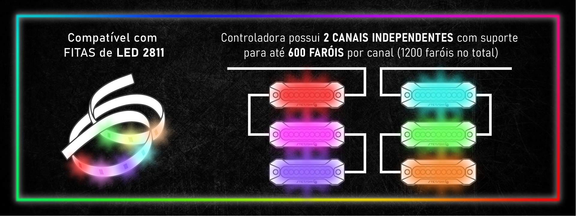 – Controladora oferece 2 canais de saída com efeitos de iluminação independentes. Compatibilidade com fitas LED no padrão de comunicação 2811 e suporte para até 600 faróis para cada canal.